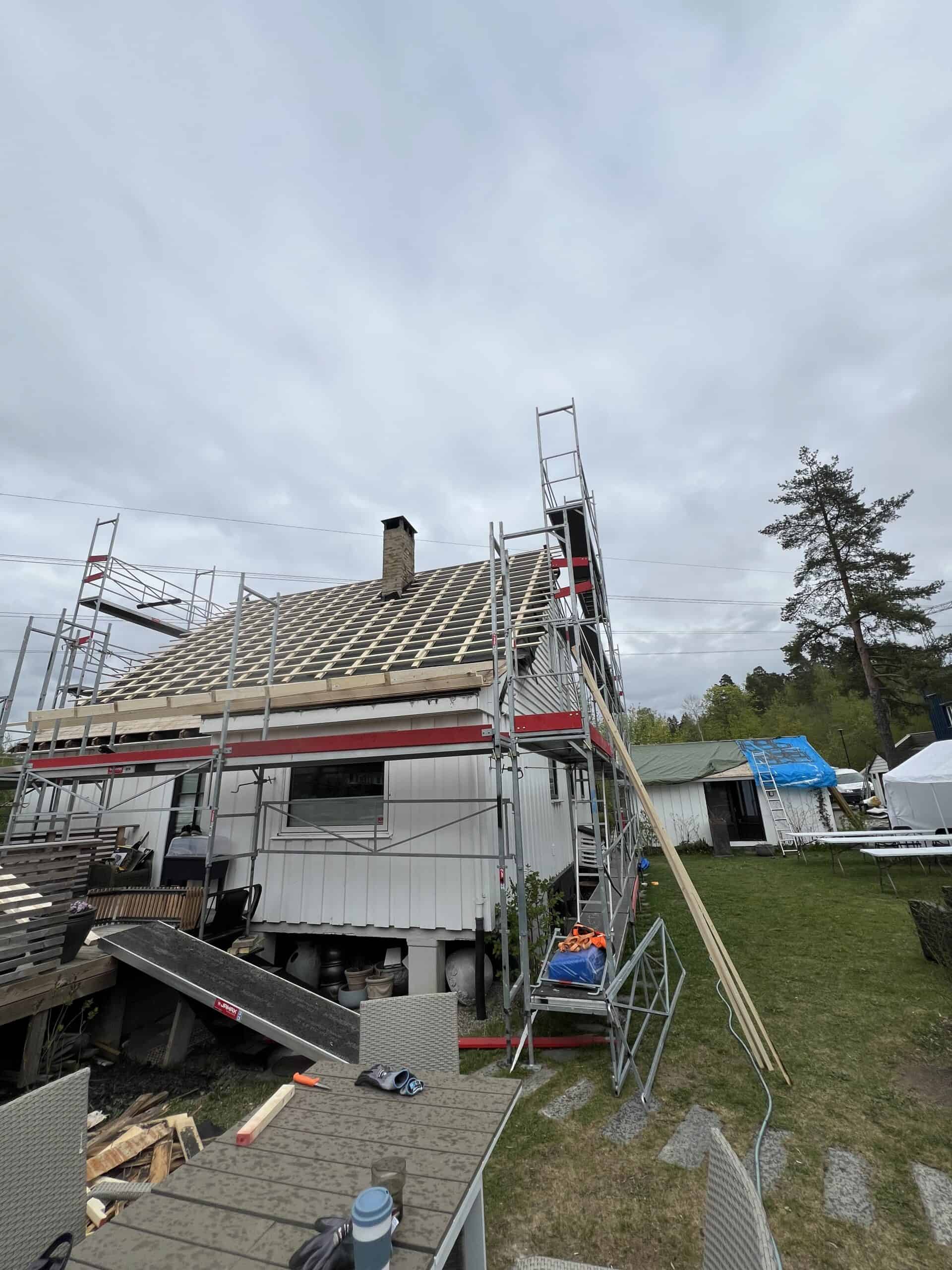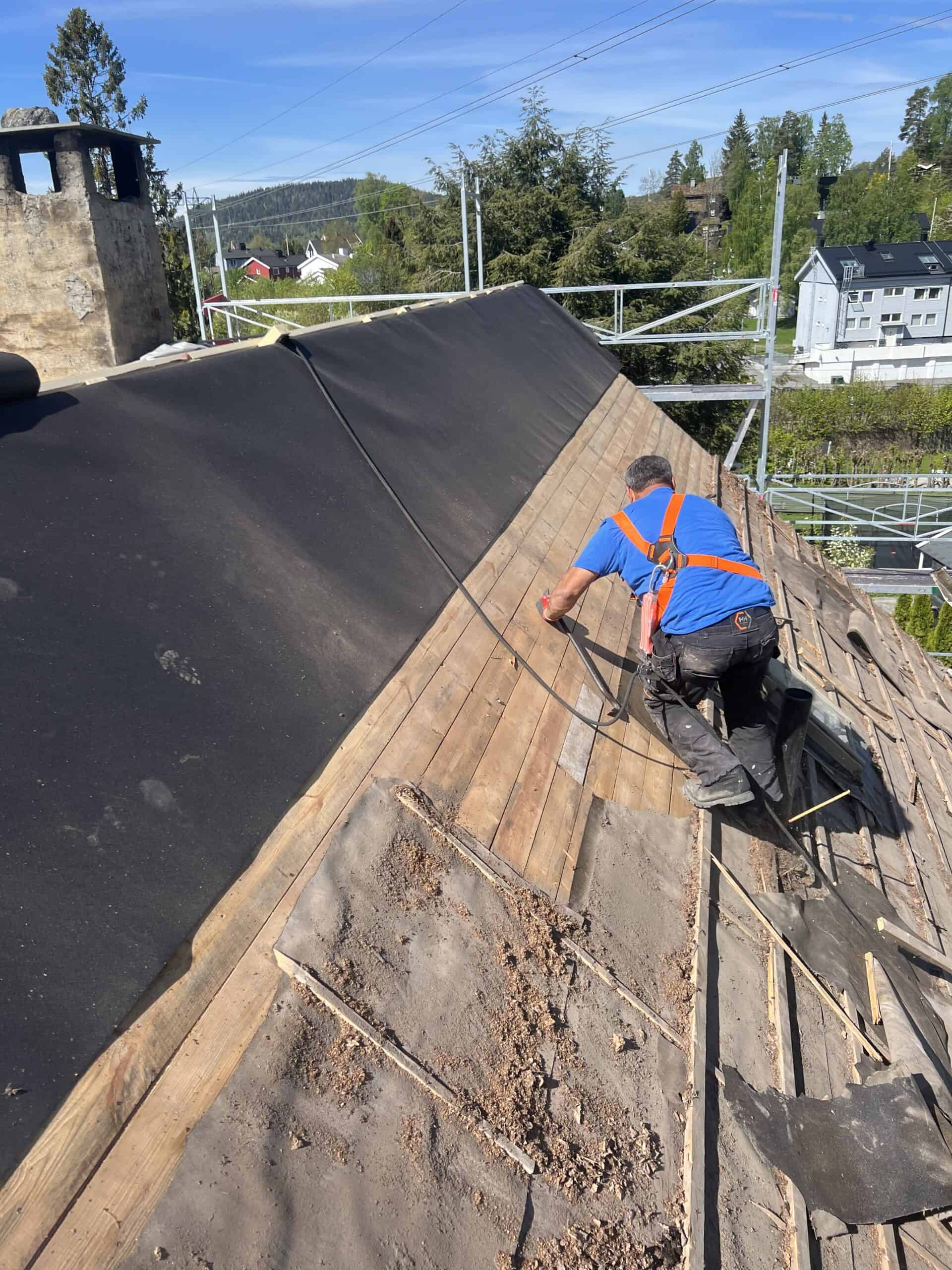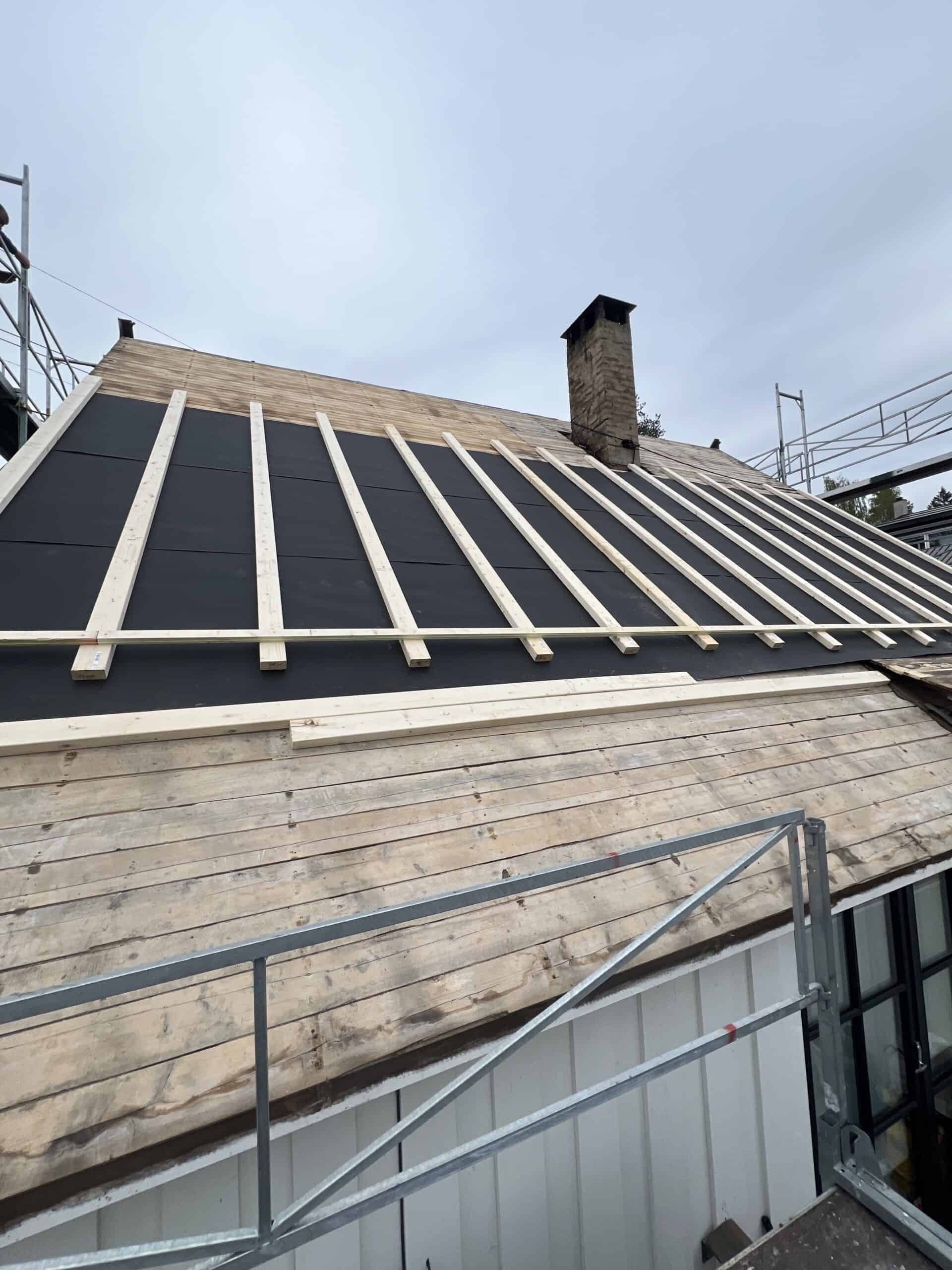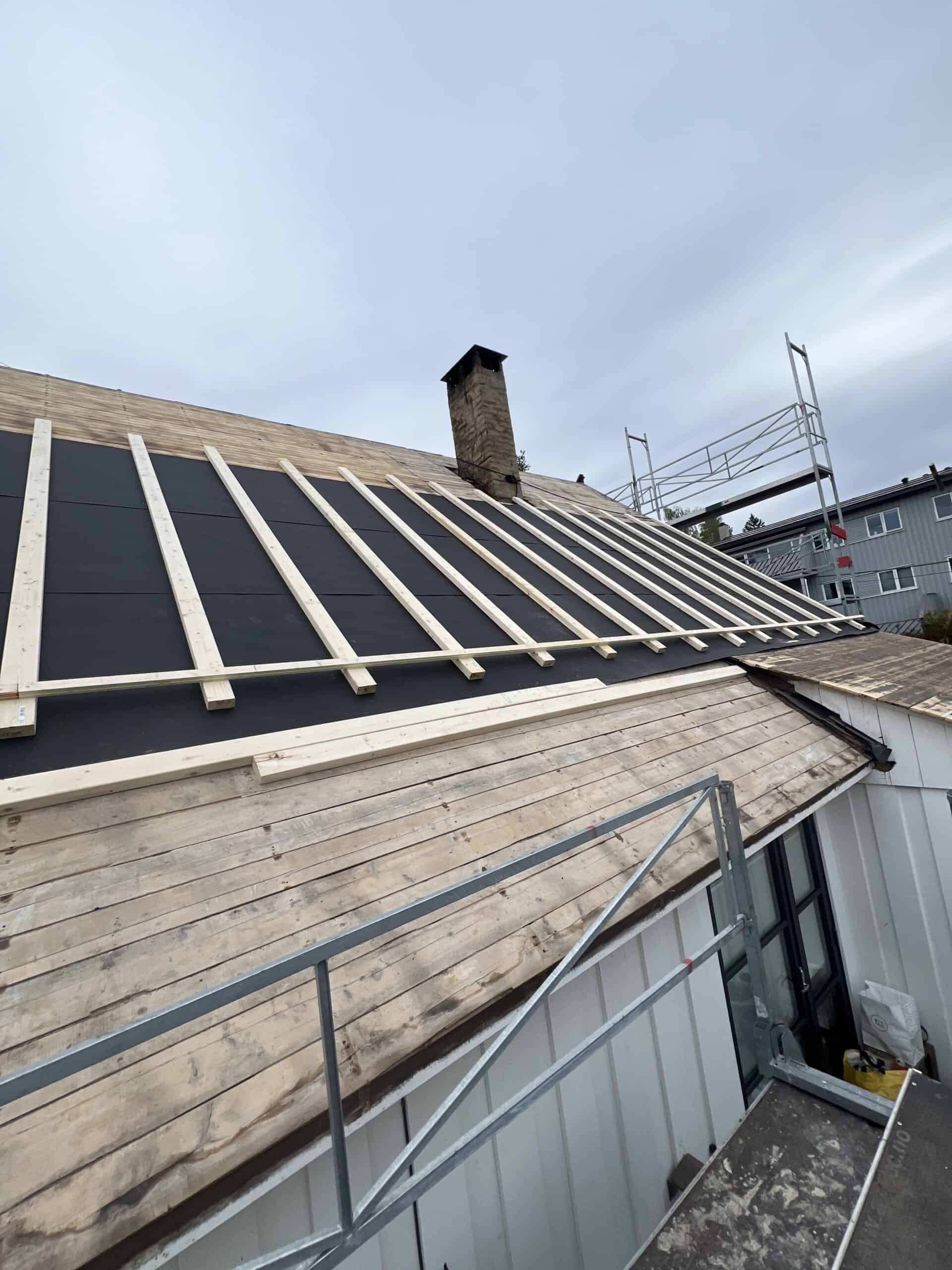 Legging av nytt tak. Lekter og underlagspapp er montert for å sikre korrekt isolasjon og festing av taktekking.