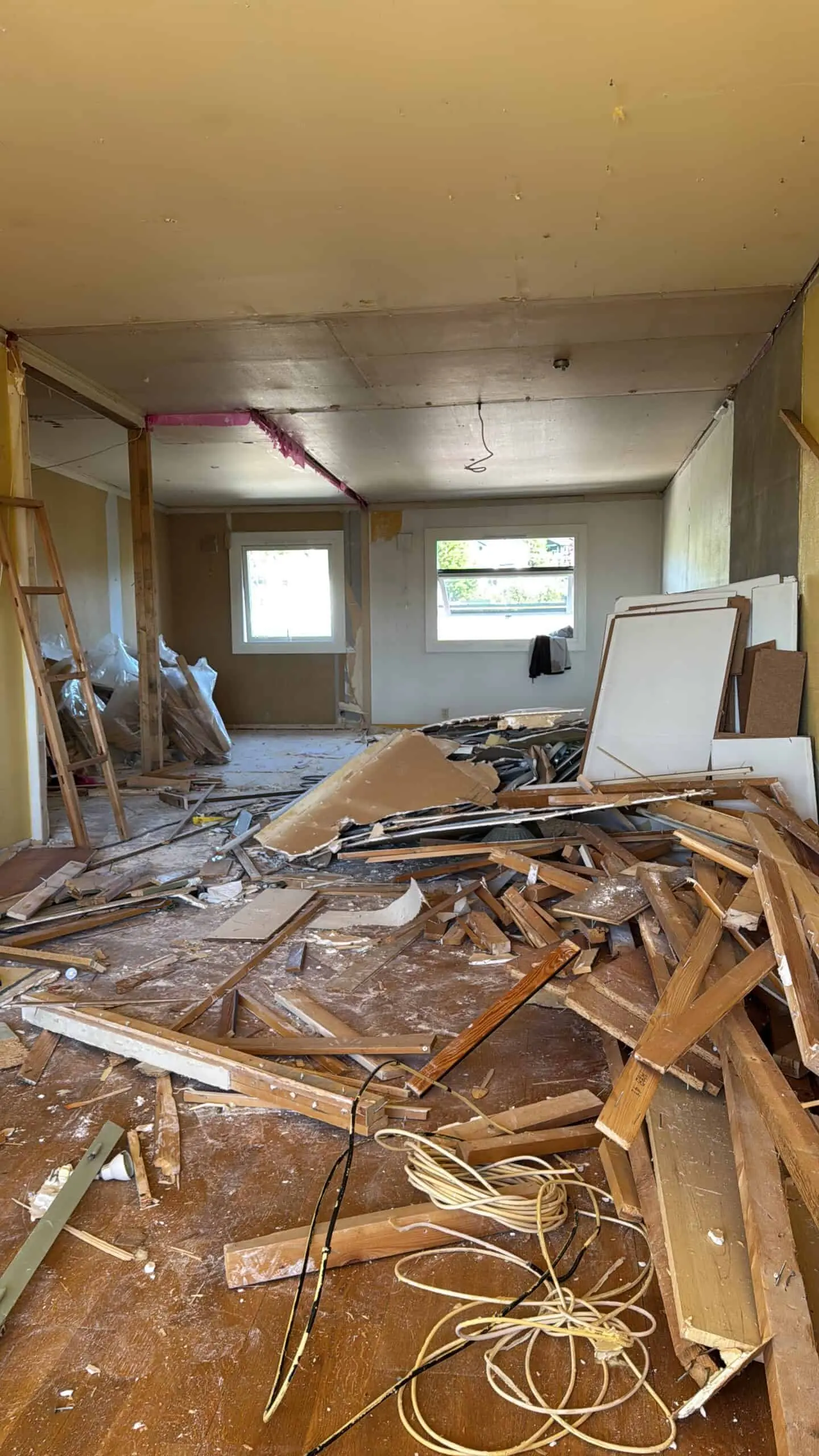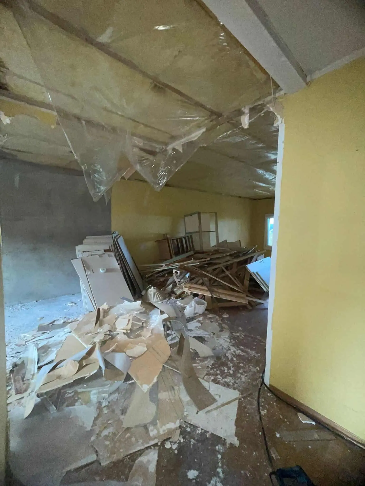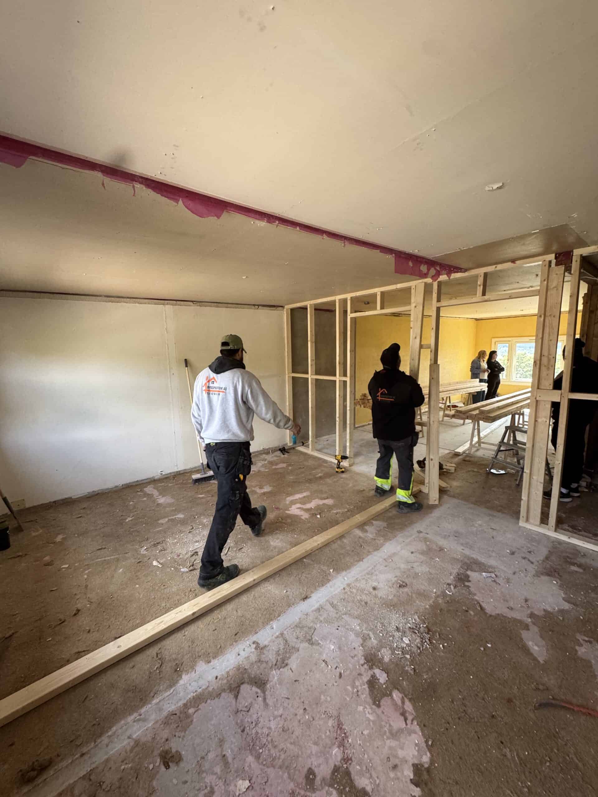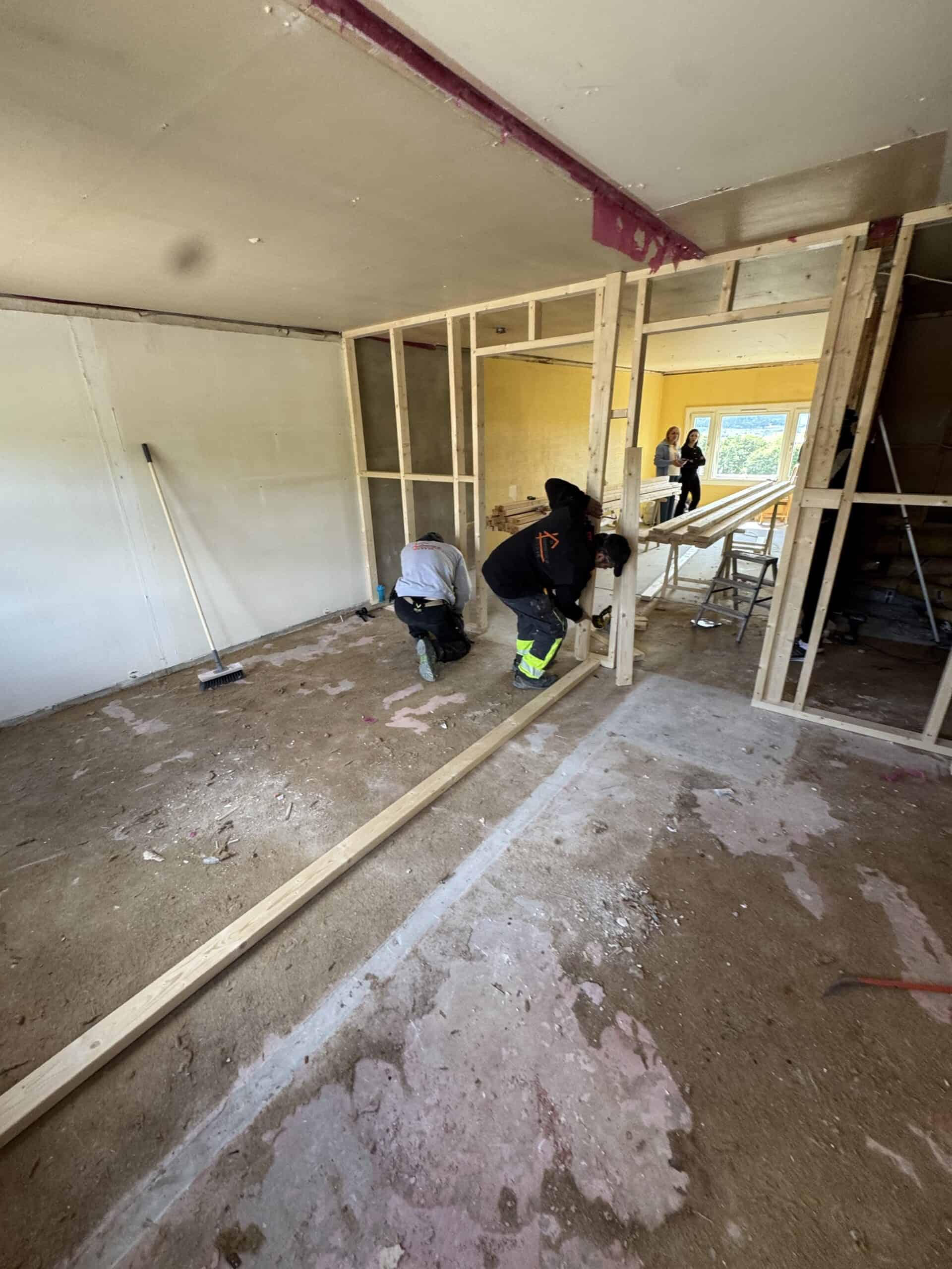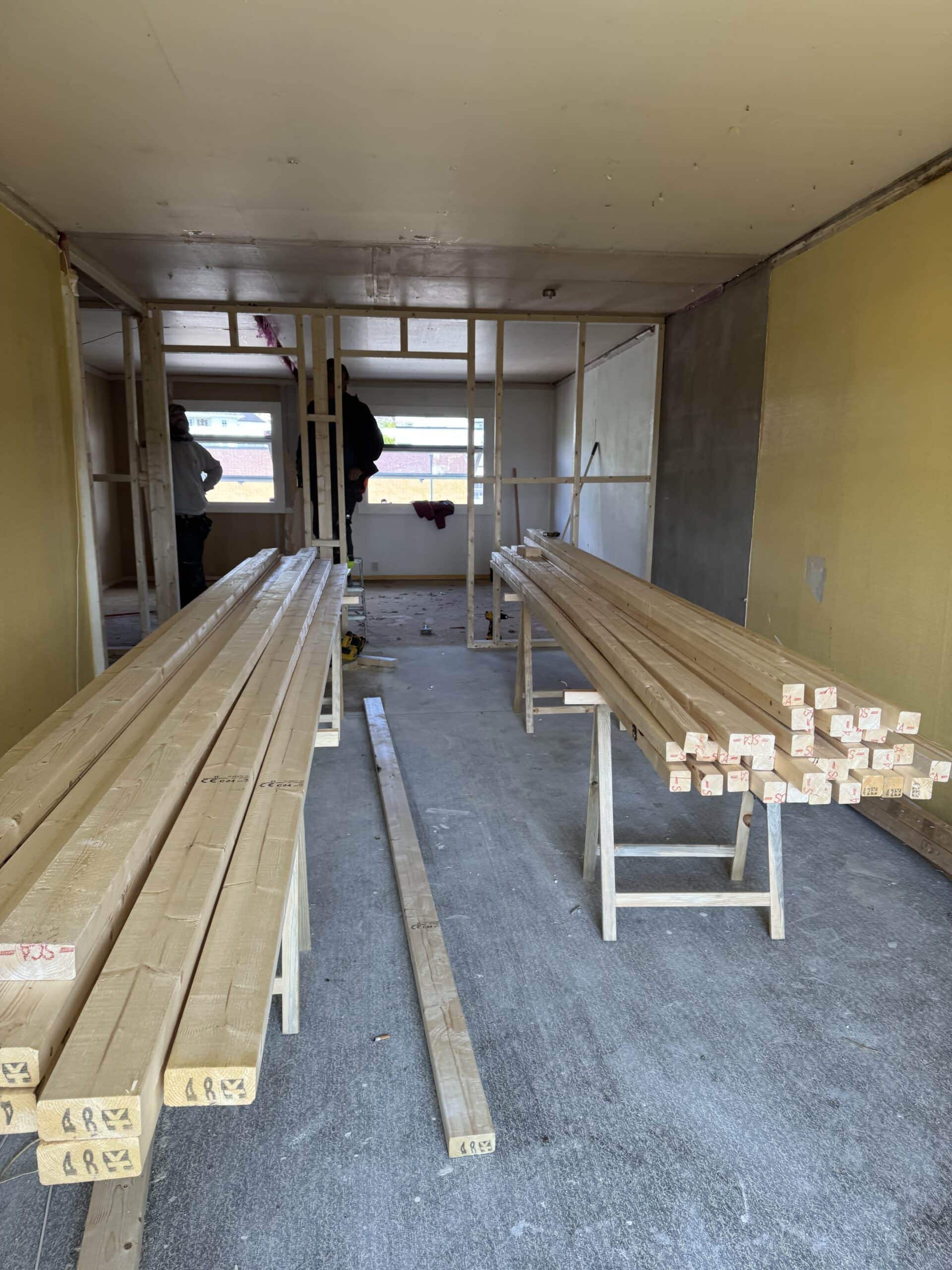 Legging av nytt tak. Lekter og underlagspapp er montert for å sikre korrekt isolasjon og festing av taktekking.